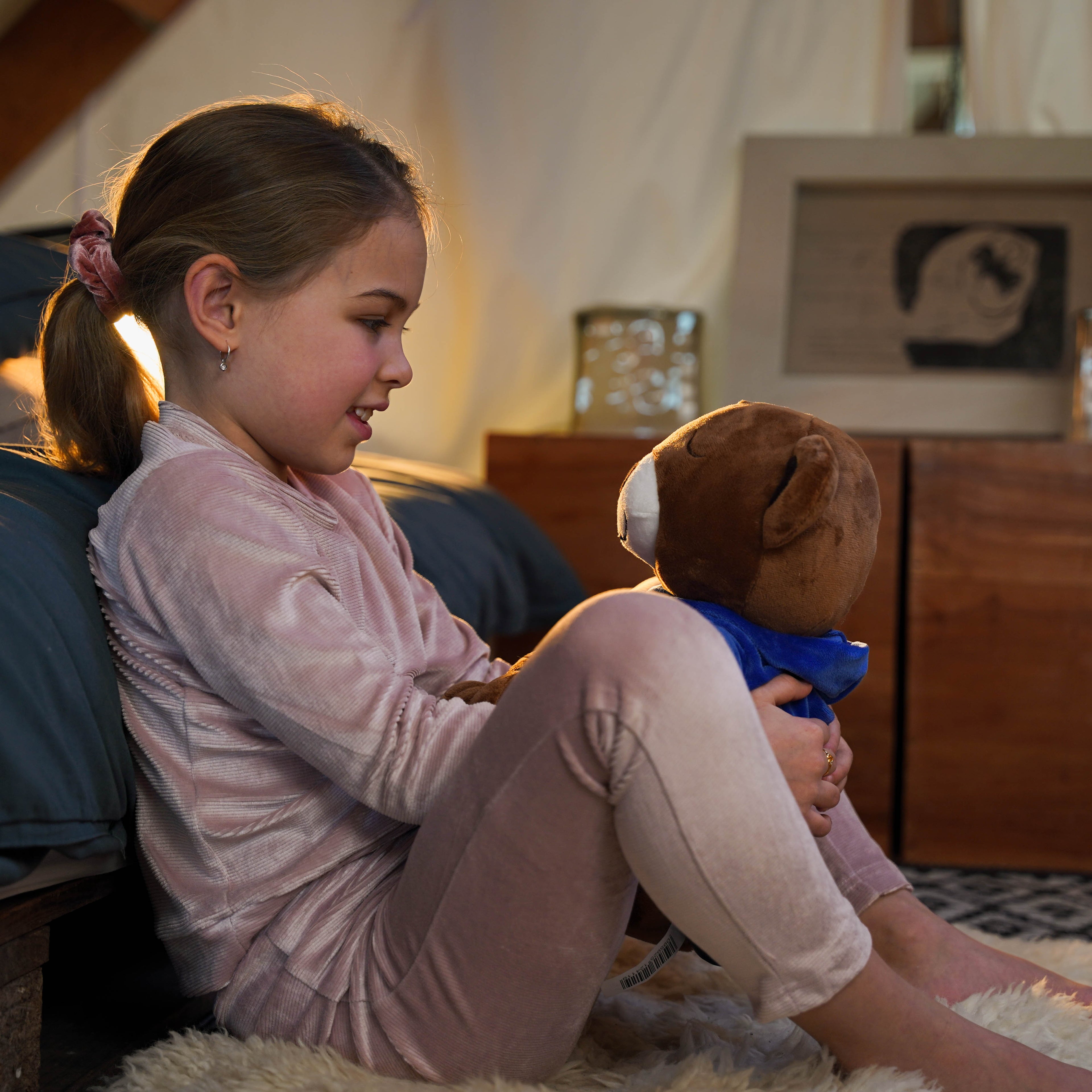 Voor onze dochter van 7 werkt deze beer heel goed. Elke avond voor het slapen gaat de beer aan en daardoor kan ze alle opgebouwde spanning van de dag loslaten. Daarna valt ze heerlijk in slaap.