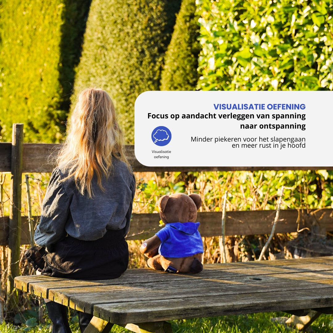 De visualisatie oefening van Meddy Bear stimuleert de verbeeldingskracht van kinderen en vermindert angst en stress. De focus ligt op het verbeteren van de concentratie, creativiteit en probleemoplossende vaardigheden van kinderen, wat hun ontwikkeling ondersteunt.
